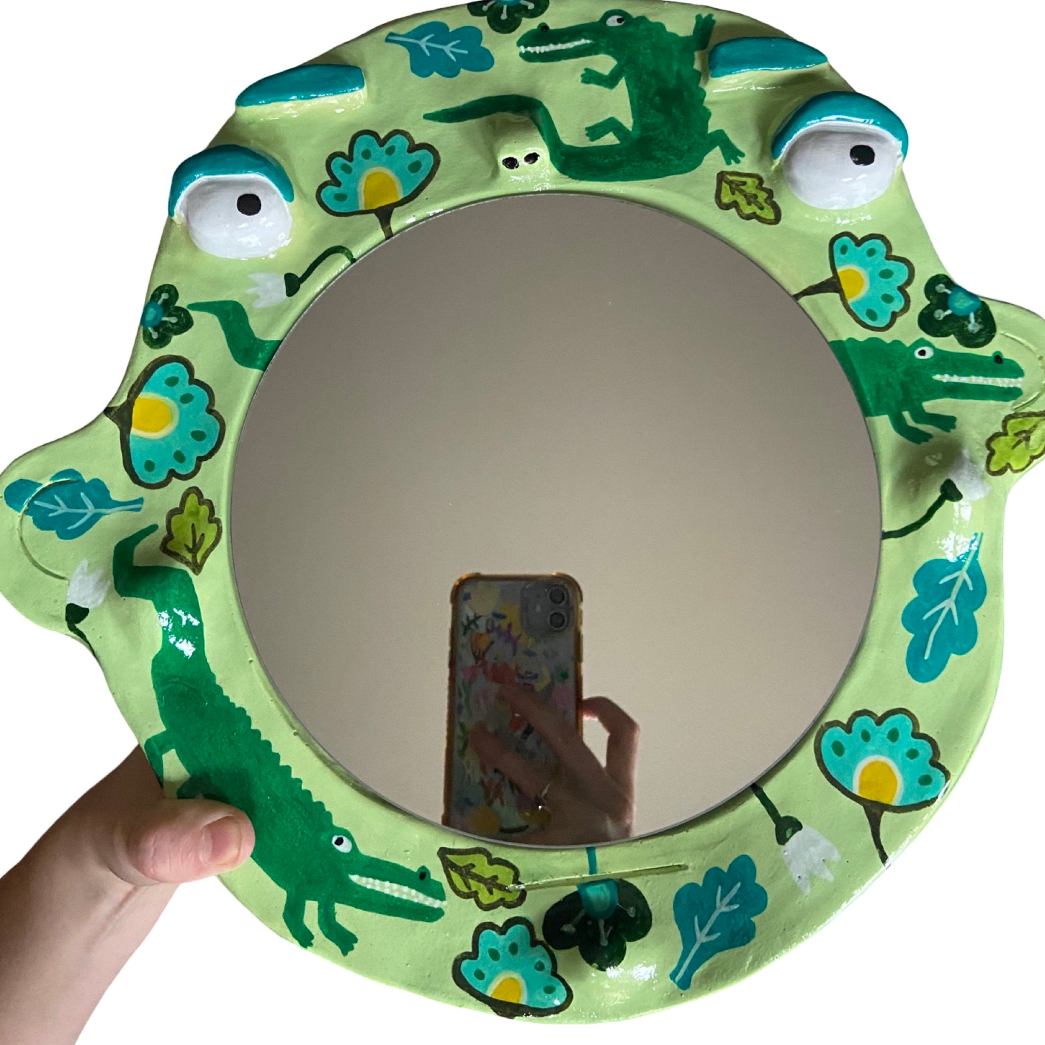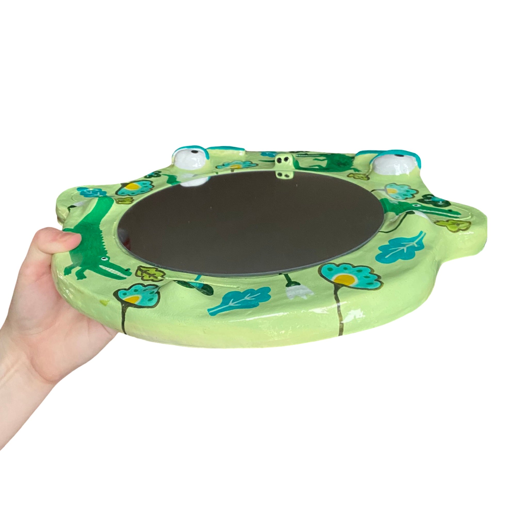 They are super big!!! The measurements of the frame are: 34.5 cm from ear to ear, 31cm length, Depth is 1.5-2.5cm. The mirror has a 20cm diameter.