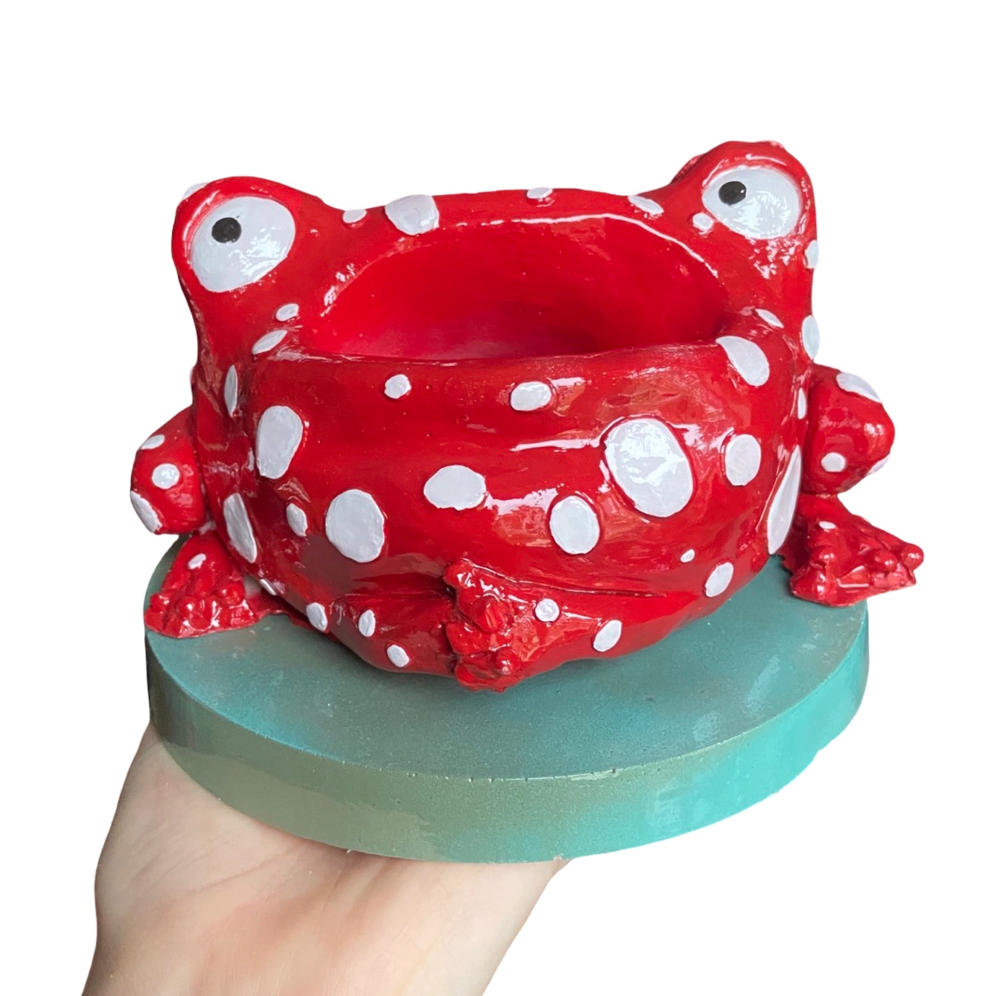 This quirky frog remote control and incense holder combines playful design with practical use. Its large mouth securely holds one standard remote or two smaller ones, keeping your living space tidy. The nostril holes are cleverly designed to hold incense sticks, allowing ash to fall neatly into the mouth below. Beyond functionality, it adds a fun decorative touch to any room and can also store jewellery or small items, making it a versatile and charming addition to your home!! Each frog sits on a lovely lily pad style matching platform, measuring 6inch.