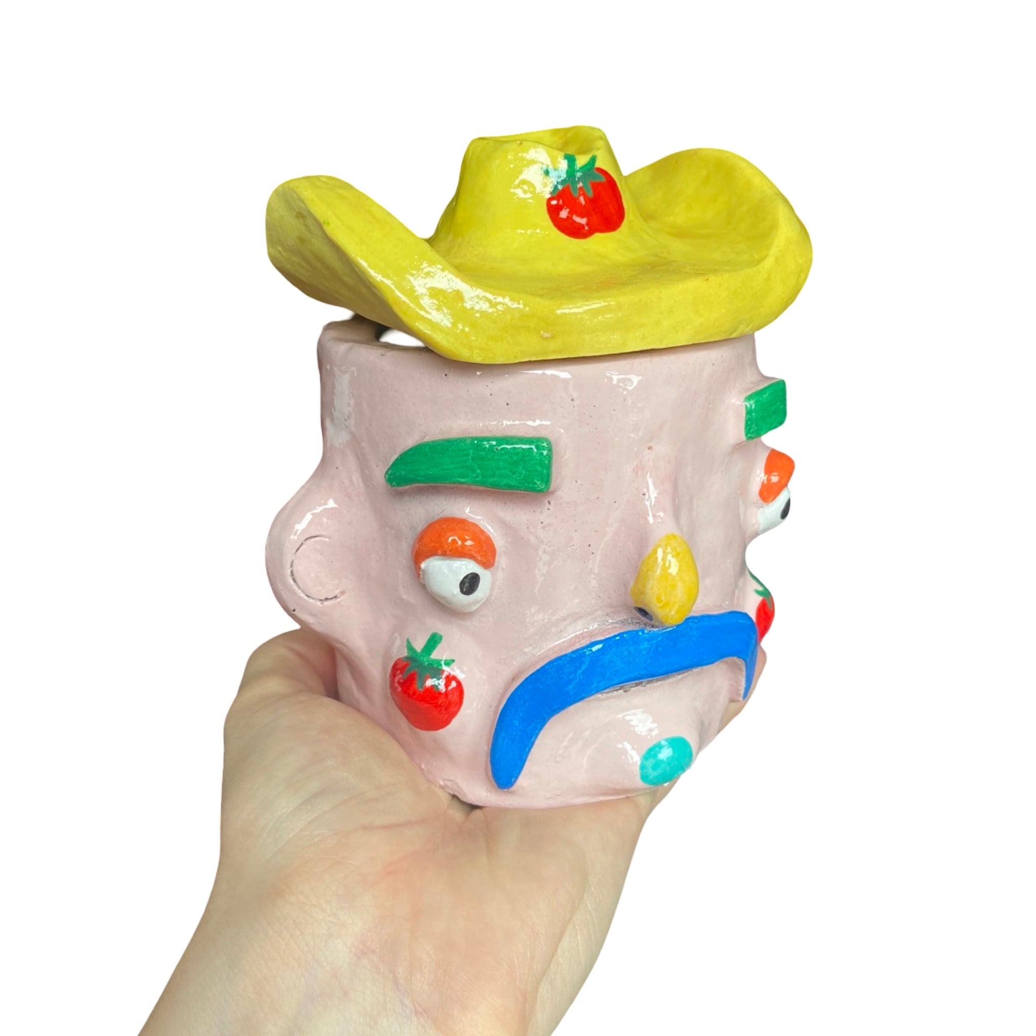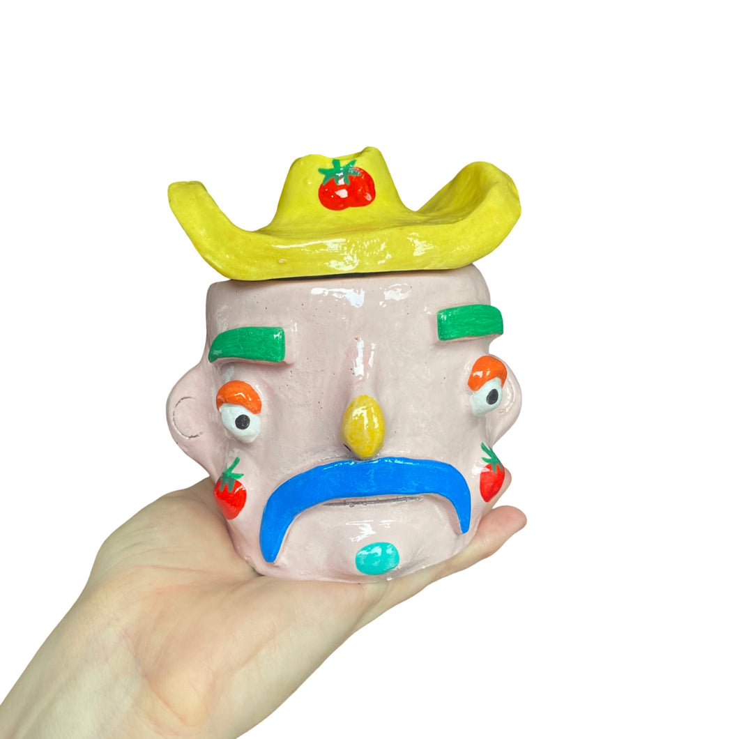 A cowboy piece of pottery, this Cow-boy pot is sure to brighten up your desk and bring a smile to your face! To accessorise his look he wears a classic cow-boy hat (Lid). He is hand-made with high quality, strong materials and finished with a high-shine glaze. Really quirky and unique home decor.